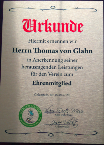 Als Anerkennung seiner herausragenden Leistungen wurde Thomas die Ehrenmitgliedschaft des GC Kohmark verliehen.